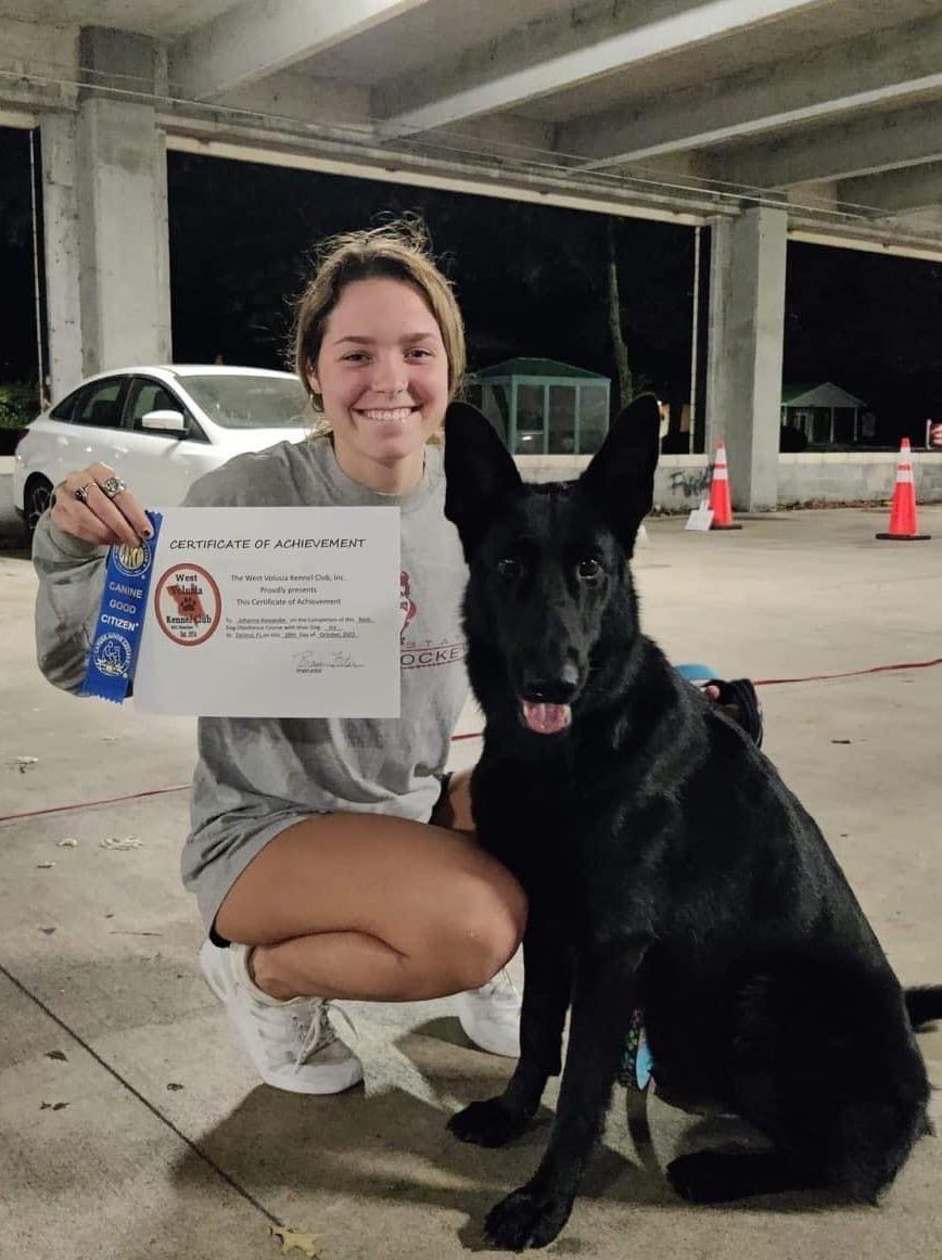 Ivy Rose is the sweetest German Shepherd dog you will ever meet!! And she loves to play, stay busy and cuddle.. She loves people so much she will be your best friend after just a short meet and greet.. She will bark to alert you to company but once properly introduced she’s all in to be your friend!! Ivy Rose also loves to barn hunt, fast cat and dock dive but she doesn’t alway like to come back out of the pool on first call because of the job she has found in swimming but after an additional lap or two around the pool she listens and climbs out!! Ivy Rose is OFA certified with excellent hips and normal elbows She is also DM clear!!